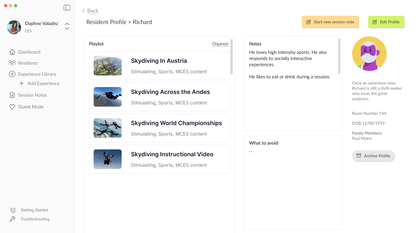 I replaced buried metadata with prominent staff notes, ensuring critical preferences (e.g., “responds to socially interactive experiences”) were visible at a glance.