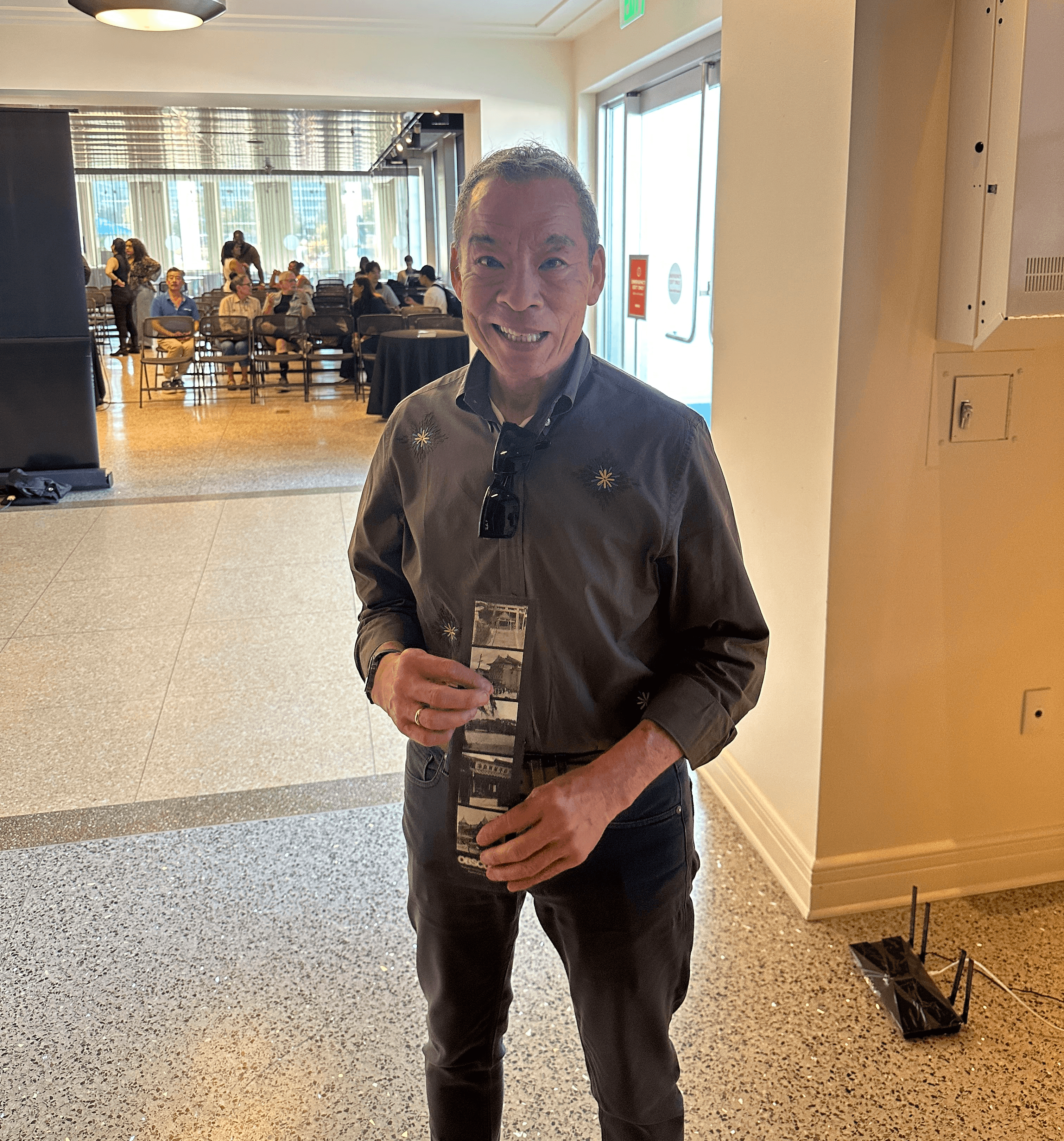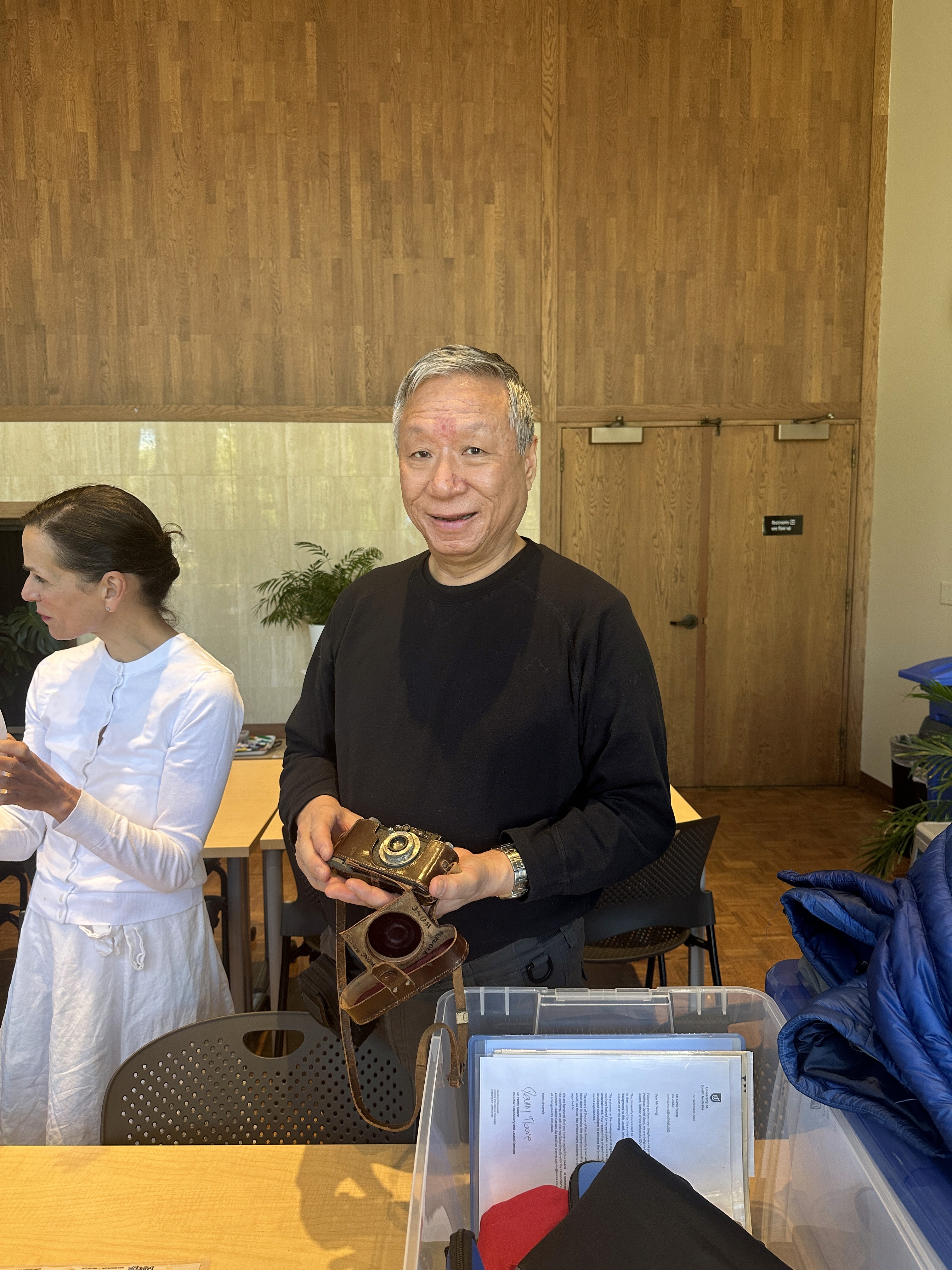 Curtis Wong holding his father's 80 year old Barnack Leica II Camera