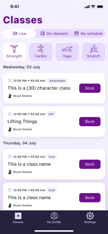 I built the design system from the ground up to maintain consistency across all five platforms. It governed color, typography, button styles, and component behavior. A key design decision was using light mode for browsing and discovery surfaces and dark mode for anything related to attending a class, creating a clear psychological shift when users entered the workout experience.
