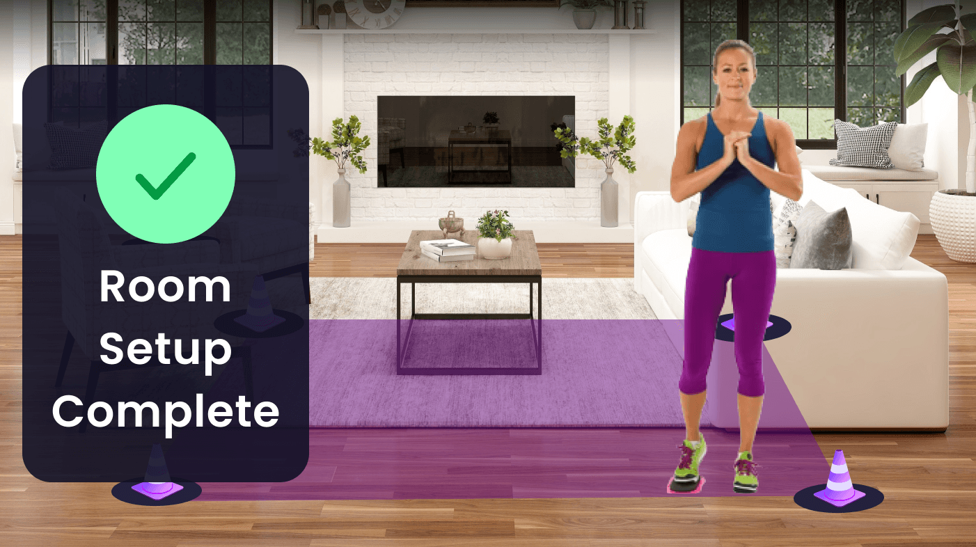 For room calibration, the system placed virtual cones and users simply walked to the corners of their space. The backend detection handled the rest. The entire setup culminated in a satisfying green checkmark confirmation.